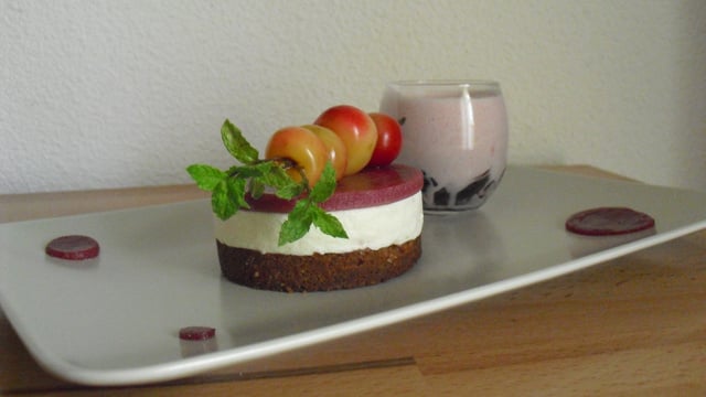 Sablé amandes, mousse d'amande, gelée de griotte au kirsch, spoom griotte et cerise Napoléon