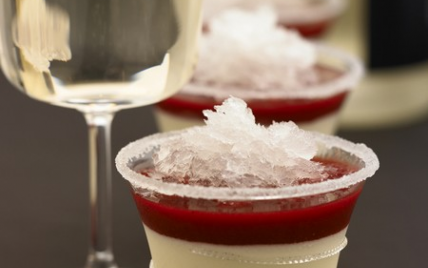 Pour la décoration, tremper le bord du verre dans du blanc d'oeuf puis dans du sucre semoule. Verser un peu de coulis de framboise et faire prendre au congélateur. Remplir les verres avec la crème aux agrumes et terminer