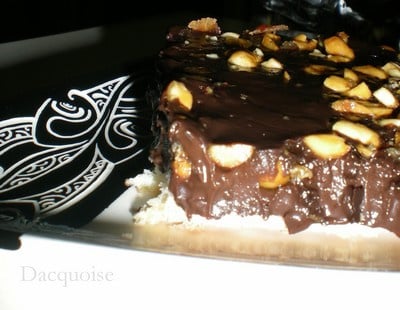 Pendant ce temps, préparez la crème au chocolat et carambar aux cacahuètes. Dans une casserole, faites fondre le chocolat en morceau, les carambars et la crème liquide, jusqu'à obtenir une crème lisse. Mixer vos cacahuètes puis faites-les griller avec une c. à s. de sucre semoule pendant quelques minutes dans une poêle. Ajoutez à votre crème 3 ou 4 cuillères à soupe de cacahuète et réservez le reste pour la déco. Versez la crème chocolat-carambar sur la dacquoise et l'étaler de manière régulière, saupoudrez-la du reste de cacahuètes grillé et placez au congélateur pendant une nuit. Sortez votre dacquoise du congélateur 5h avant de la servir et la placez au réfrigérateur.