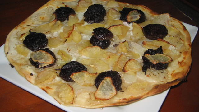 Flammekueche limousine avec pommes Golden AOP et boudin noir en entrée.