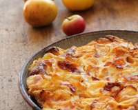 Beurrez un plat, répartissez les pommes et versez la préparation par-dessus.