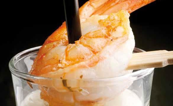 Piquer les crevettes sur des pics en bambou et servir avec une paille.