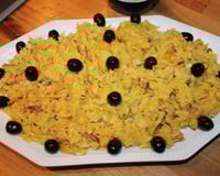 Mettez le tout dans 1 plat et décorez d'olives noires, servez aussi tôt.
