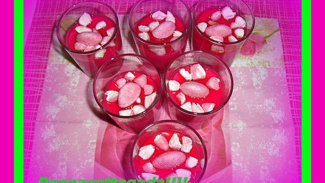 Pendant ce temps coupez les fraises en touts petits cubes. Quand les panna cotta sont bien prises répartissez les cubes de fraises dans les verrines et terminez en ajoutant un joli filet de sirop et une fraise Tagada entière.