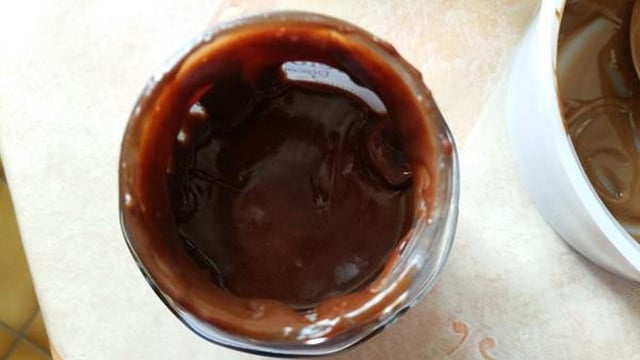 Lorsque la pâte est à votre goût, faites chauffer au micro-ondes, les 85 grammes de chocolat au lait et les 85 grammes de chocolat praliné ou pralinoise... Et là... C'est vous qui allez mener la danse, si je puis dire ! Vous allez ajouter de la pâte à la noisette au chocolat au lait, autant que selon vous ça en aura besoin... Attention! Le mélange va devenir très compacte et grumeleux, ne vous inquiétez pas, c'est normal ! C'est le choc thermique du chocolat chaud avec la pâte à la noisette froide... Donc, vous allez rajouter 2 cuillères à soupe de lait en poudre dissout dans de l'eau, à ce qui va devenir votre pâte à tartiner... Surtout ne mélangez pas! Mettez directement le tout au micro-ondes, sinon le lait froid va encore plus grumeler et épaissir votre pâte à tartiner. Donc, faites tiédir au micro-ondes et ensuite, remuez... Rajoutez du chocolat praliné fondu cuillère à soupe par cuillère à soupe à la préparation, mélangez et goûtez. Si c'est, une fois de plus, très compacte, ajoutez 1 ou 2 cuillère à soupe de lait pour délier la préparation et comme pour l'autre fois... NE MELANGEZ PAS ! Passez le tout au micro-ondes. Rajoutez une cuillère à café de cacao en poudre amer. Mélangez et goûtez. Si le mélange est encore trop compacte hop, lait + micro-ondes jusqu'à ce que la texture soit à votre goût. Ainsi, continuez à faire cela aussi longtemps que votre pâte à tartiner ne vous conviendra pas ! N'oubliez pas que vous pouvez également rajouter de la pâte à la noisette, ou du cacao en poudre amer, mélanger et bien sûr goûter. Je sais, je sais, on n'arrête pas de goûter mais, c'est la condition sine qua non à la réussite de votre pâte à tartiner.