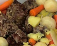 Ajoutez à la viande 2 gros oignons émincés, 4 navets coupés en 4, 4 carottes coupées en tronçons, 2 feuilles de laurier et 2 branches de thym frais. Mouillez avec 1 litre de bouillon de légumes, portez à ébullition, peu laissez mijoter à feu doux pendant 1h30.
