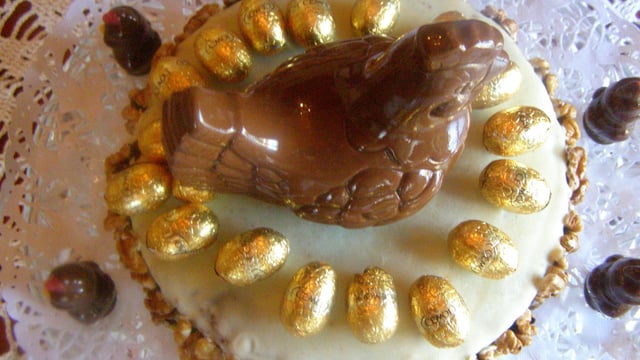 Glacer le gâteau de Pâques avec les chocolats blanc pour le dessus et noir tout autour du gâteau. Appliquer tout autour les noix et les amandes , au centre les sujets la poule les oeufs, poussins.