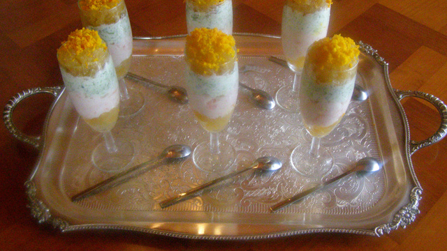 Montage des verrines : Verser un peu de gelée dans le fond de chaque verrine .Disposer la mousse de crevettes puis celle de concombre.Terminer avec le reste de gelée. Saupoudrer du zeste d'orange et laisser reposer 180 mn au frais. Servir à un apéritif, comme entrée ou à un repas dînatoire. Ces verrines seront fort appréciées.