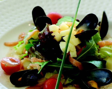 Dans un grand saladier, mélanger les pommes de terre avec les haricots verts cuits, le mesclun, les miettes de thon, le saumon fumé détaillé, les moules cuites, l'échalote et les tomates cerises.
