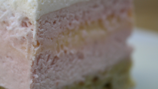 Gâteau composé d'un sablé pistache, d'un bavarois mascarpone-framboise et d'une crème de citron.