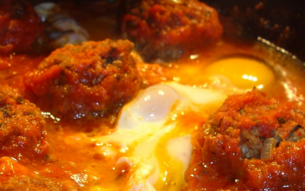Boulettes de boeuf dans une soupe à la tomates, courgette et poivrons avec un oeuf poché et des épices !