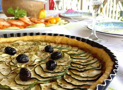 Couvrir le fonds de tarte avec la sauce tomate. Répartis le poisson et la féta,et dispose enfin les rondelles de courgettes en rosace.