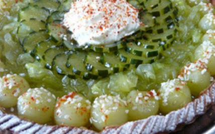 - Couper une quarantaine de rondelles de concombre cannelées, une trentaine de boules et la valeur d'un bol de concombre râpé