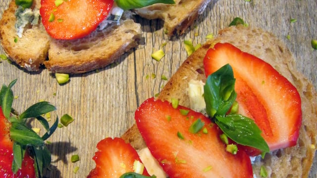 Répartissez le fromage sur vos tranches de pain, dressez les fraises et décorez avec les petites feuilles de basilic.