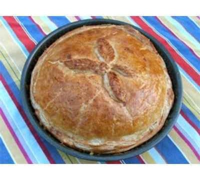 Garnissez la tourtière de cette préparation, repliez les bords, mouillez les légerement avec du jaune d'oeuf. Couvrez avec la pâte feuilletée, faites un trou dans le milieu de la tourtière, laissez reposer environ deux heures. Pendant ce temps, mélangez les 3 oeufs, la crème et le lait. Salez, poivrez, ajoutez un peu de noix de muscade.