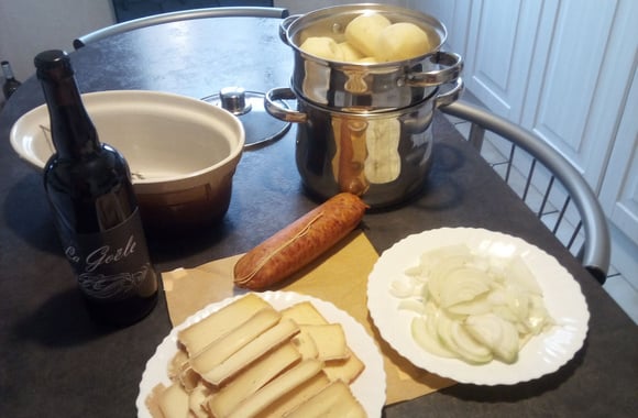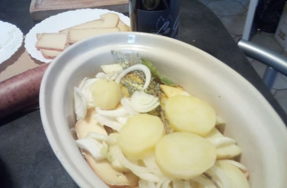 5Epluchez les pommes de terre, coupez les en lamelles et disposez les dans un plat à gratin en intercalant pommes de terre, oignons et fromage. Placez votre saucisse de Morteau au coeur de votre plat à mi-hauteur des produits.