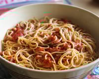 Faites cuire vos spaghettis, égouttez-les et mélangez-les avec la sauce.