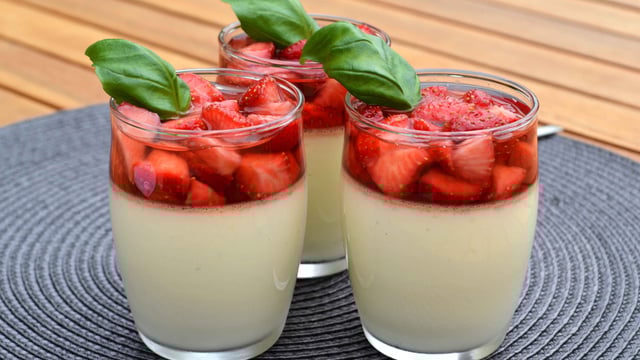 Sortez les verrines du frigo, recouvrez la panna cotta de fraises avec un peu de sirop et placez au congélateur 10 minutes pour que le sirop se solidifie un peu.