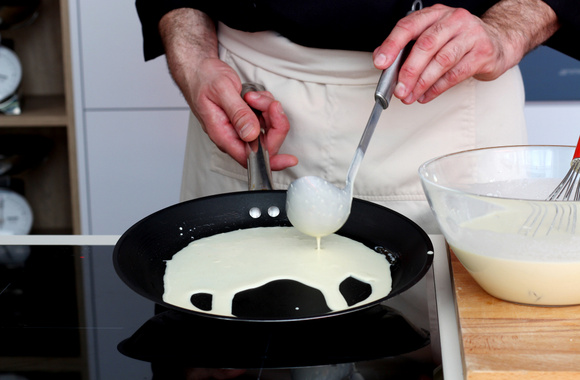 7Ajoutez une louche de pâte et répartissez-la sur toute la surface en bougeant la poêle.