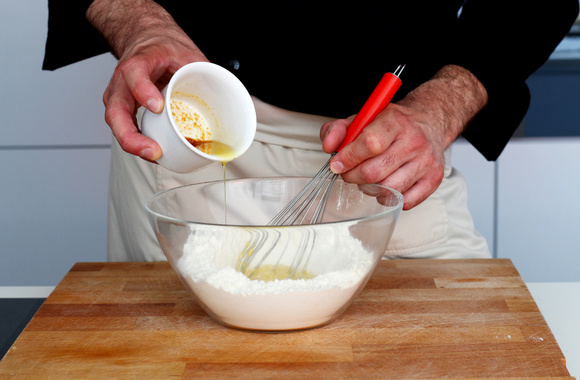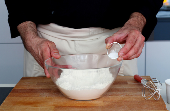 1Mélangez la farine et le sucre dans un bol et ajoutez le sel.