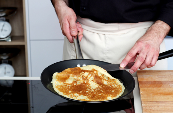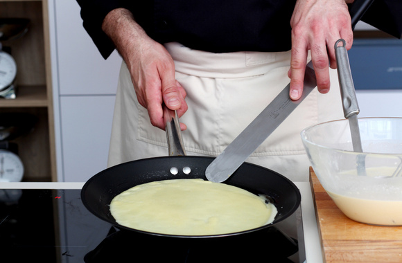 8Quand le dessous est cuit, retournez la crêpe.