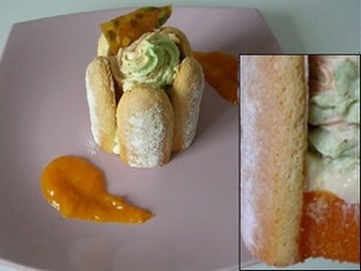 Je vous propose une petite charlotte individuelle, avec une déclinaison de l'abricot sous forme de coulis, de compote et mousse d'abricot, accompagnée de pistache, sous la forme de mousse de pistaches et nougatine, ainsi qu'une pointe de fève tonka dans une fondante pana cotta.
