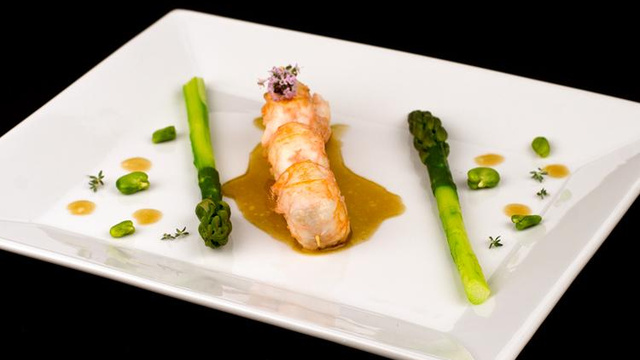 Déposer un peu de sauce entre les asperges et poser les brochettes de langoustines dessus.
