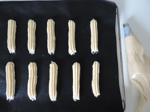 3Remplir une poche à douille et faire des petits boudins de 7cm sur le papier sulfurisé. Enfourner dans un four préchauffé à 200° pendant 6min30. Laisser refroidir sur une grille.