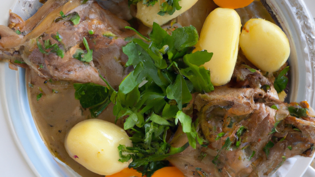 - 2Le jour :Epluchez et lavez les carottes et les pommes de terre, puis coupez les en cubes de 1 cm.Egouttez et épongez le lapin, reservez la marinade.Assaisonnez les morceaux, roulez-les dans la farine puis faites-les revenir dans 5 cl d'huile dans une cocotte en fonte, et ajoutez les légumes de cubes.Mouillez avec 30 cl de marinade et 15 cl d'eau, et laissez frémir 35 minutes.Enlevez les morceaux, et réduire la sauce si necessaire, elle doit être nappante.Servez dans un plat, avec des oignons frits par dessus.