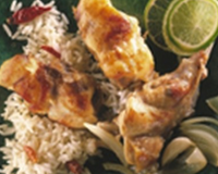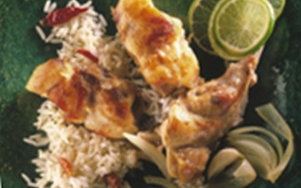 Servez avec du riz créole et un décor de bananes, ananas, et kiwis.