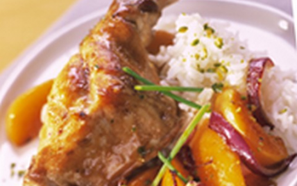 Ajoutez les épices, salez, poivrez, arrosez de bouillon de volaille et ajoutez 1 verre du sirop des pêches.