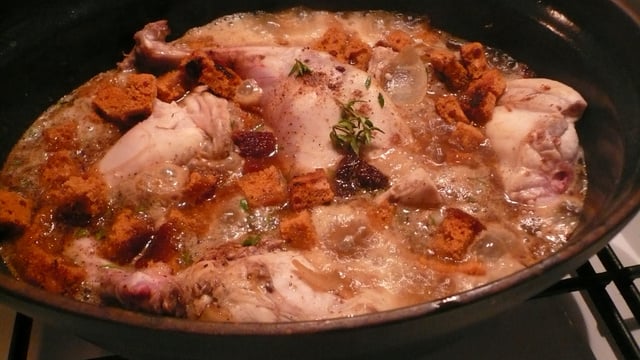 Faire dorer les morceaux de lapin avec les oignons dans l'huile pendant 5 à 10 minutes.