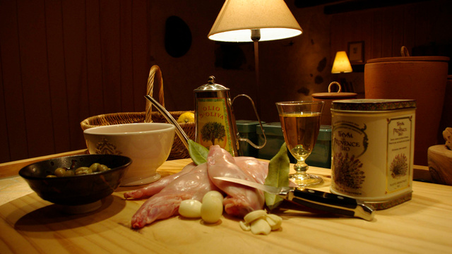 Déglacer au vin blanc. Faire réduire 1 ou 2 minutes et ajouter les olives, le thym et la sauge. Remettre le lapin. - 3