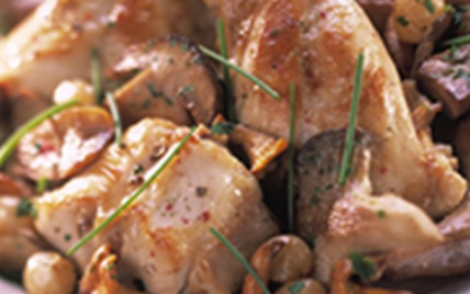 Ouvrez la cocotte, versez les champignons et les grains de raisin. Continuez la cuisson 20 mn. En fin de cuisson,ajoutez la crème fraîche. Servez décoré de ciboulette.