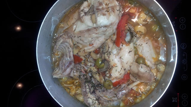 Faire dorer le lapin et les oignons émincés dans un fait tout et un fond de beurre, une fois la viande bien grillée,y ajouter un verre de vin blanc et un demi verre d'eau ainsi qu'un bouillon de volaille, le persil, et le thym. Remuer pour bien parfumer la viande. Laisser cuire à l'éttoufé 5 bonnes minutes puis incorporer les tomates, les champignons, les olives et une cuillère de crème fraiche. Continuer de remuer régulièrement et ajouter le sel et le poivre selon vos goûts. Laisser cuire une bonne demi heure à feu doux en remuant de temps en temps, jusqu'à ce que le lapin vous paraisse bien cuit à coeur.
