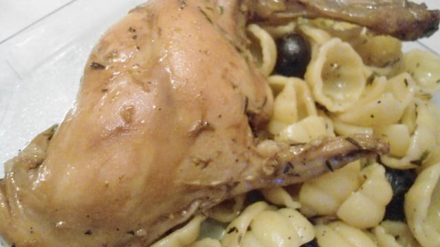 Faites dorer 10mn les morceaux de lapin et les gousses d'ail non pelées avec l'huile d'olive et le beurre dans une cocotte,poivrez la viande, ajoutez les olives et le thym. - 2Versez le vin et portez à ébullition.(pas mis).