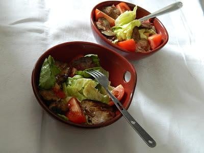 Déposez votre salade dans des bols ou assiettes, ajoutez les dès de comté, les tomates et ensuite les foies coupés en morceaux et assaisonnez.