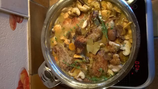 Ajoutez les lardons et faites simplement chauffer pas trop longtemps. Ensuite ajoutez vos champignons, après quelques minutes toujours à feu doux ajoutez les deux verres de vin blanc sec, le bouillon et la moutarde douce (quantité suivant votre souhait). Laissez mijoter.