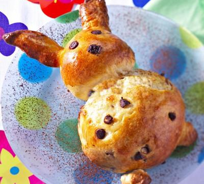 Façonner chaque pâton en ovale pour faire le corps du lapin. Pétrir le 1/3 de pâte réservée et le diviser pour faire 12 têtes rondes, 24 grandes oreilles (les faire plus grandes que la tête) et 24 bouts de pattes. Sur la tôle du four légèrement humidifiée, reconstituer, en les espaçant, chacun des 12 lapins (1 tête + 1 corps + 2 oreilles + 2 bouts de pattes). Disposer sur chaque tête de lapin 2 pépites de chocolat pour faire les yeux et une pour le museau en les enfonçant légèrement. Laisser lever 1 heure encore.