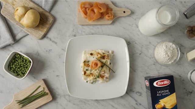 Beurrez le plat de Lasagne. Ajoute-y une première couche de béchamel, puis autant de feuilles de Lasagne nécessaires à couvrir le plat. Ajoutez ensuite les tranches de saumon fumé, de scamorza, les petits pois, et un brin de ciboulette. Répétez l’opération au moins 4 fois.