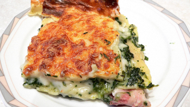 Dans une plat beurré, posé une feuille de lasagne, une couche d'épinard, une tranche de lard, une nouvelle feuille de lasagne et ainsi de suite... Adaptez le montage à la forme de votre plat.