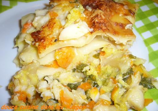 Dans un plat allant au four, mettre une couche de poisson-légumes puis couvrir de lasagne verser de la sauce, remettre une couche de poisson-légumes puis lasagne et sauce ainsi de suite, terminer par le fromage râpé. Cuire 35 à 40 mn à 180°.