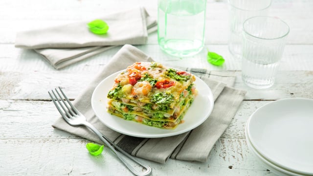 Répétez l’opération pour avoir 5 couches en alternant lasagne, velouté, poisson et pesto. Finissez par une couche de velouté et quelques gouttes de pesto genovese (faites attention d’avoir assez de velouté pour couvrir complètement le haut de la cinquième couche).