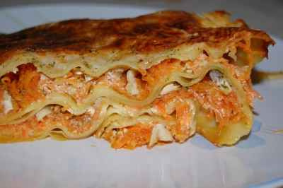 feuilles de lasagne, carottes, chèvre, crème, recouvrir avec des feuilles de lasagne et parsemer de gruyère râpé. Arroser le dessus avec un peu de crème, saupoudrer d'une pincée de persillade. - 4