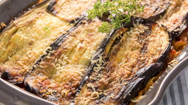 Optez pour ces lasagnes d'aubergines à la sauce tomate, accompagnées d'une belle salade verte.