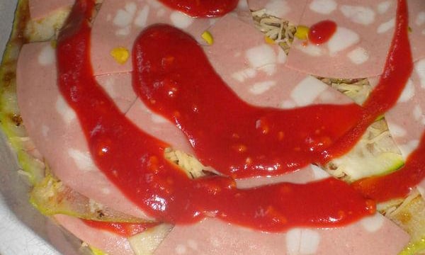 Dans un grand plat en terre ou verre, alterner les couches de sauce tomate, courgettes, gruyère râpé, mortadelle jusqu'à épuisement. Terminer par du gruyère râpé et laisser le plat en attente au réfrigérateur en attendant le moment de le cuire à four chaud (th.7-200°C) 40 minutes. Ce plat se consomme également froid.