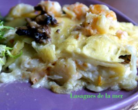 Commencer le dressage dans un plat allant au four : Une couche de sauce, des lasagnes, du poisson émietté, quelques crevettes, des Saint-Jacques, des champignons. Recouvrir de sauce et recommencer l'opération. Finir avec une couche de lasagnes et de sauce recouvert de gruyère.