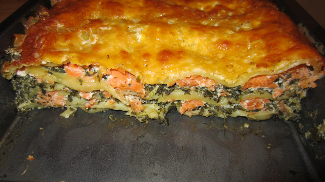 Dans le fond du plat, disposez des feuilles de lasagnes, 1/3 du mélange du saladier, 1/3 des lanières de saumon, des feuilles de lasagnes, à nouveau 1/3 du mélange, 1/3 de saumon, des feuilles de lasagnes, le reste du mélange, le reste de saumon et les feuilles de lasagnes restantes.