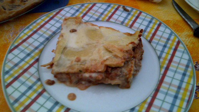 - 5Dans un plat, disposez deux lasagnes pour recouvrir le fond.Mettez une couche de viande/tomates, puis de béchamel.Recommencez jusqu'à avoir une derniere couche de lasagne sur le dessus, et la recouvrir de béchamel.