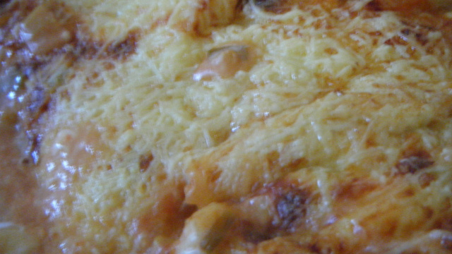 Beurrez un plat à gratin, disposez au fond trois louches de béchamel, puis disposez les pâtes sur la sauce et recouvrez généreusement de sauce tomates et légumes. Répétez l'opération jusqu'à ce que le plat soit rempli. Mettez une dernière couche de béchamel puis parsemez de gruyère râpé.